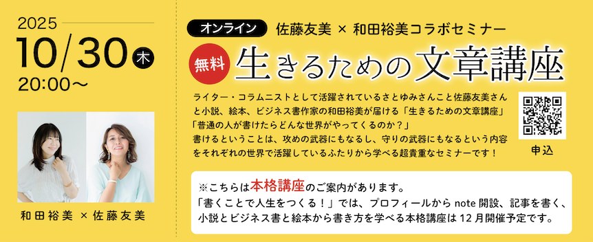 TOP 一覧 和田裕美×佐藤友美「生きるための文章講座」に登壇しました 和田裕美×佐藤友美「生きるための文章講座」に登壇しました 出演 2025.10.31 ビジネス書著者・小説家・絵本作家の和田裕美さんと、文章についての講座をさせていただきました。 テーマは「普通の人が書けるようになったら、何が変わるのか」です。私は常々、「ライティング力は、ライター以上に、そうじゃない人たちにとってこそ強い武器になる」と思っています。 それでは「何をどう変えれば武器になるのか」ということについて、お話させていただきました。 さとゆみ タグ さとゆみライター佐藤友美