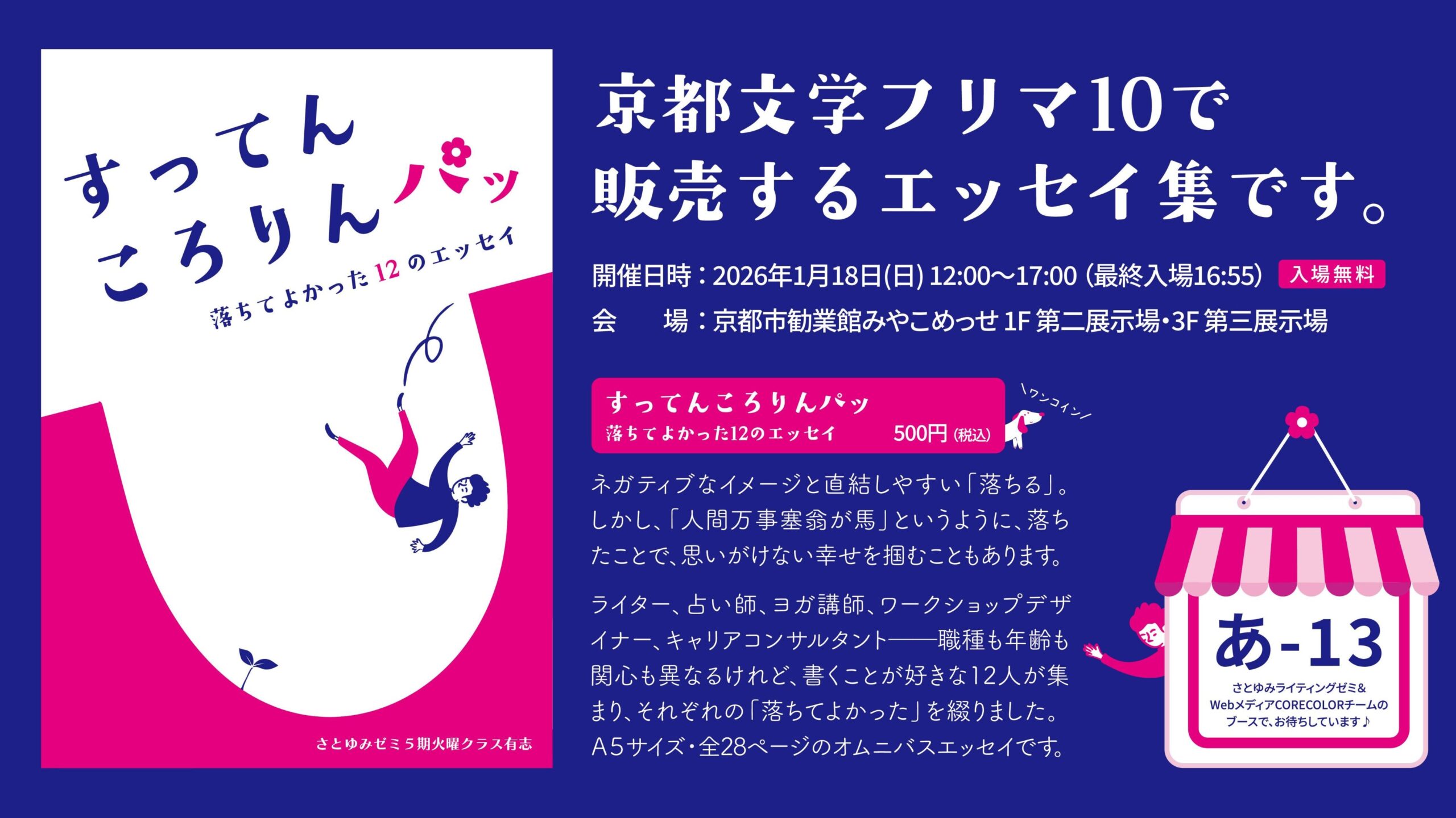 1月18日(日)京都市勧業館みやこめっせにて開催される「文学フリマ京都10」に、さとゆみライティングゼミとCORECOLORチームが出店いたします。 さとゆみライティングゼミで作ったエッセイ集、CORECOLORチームの […]