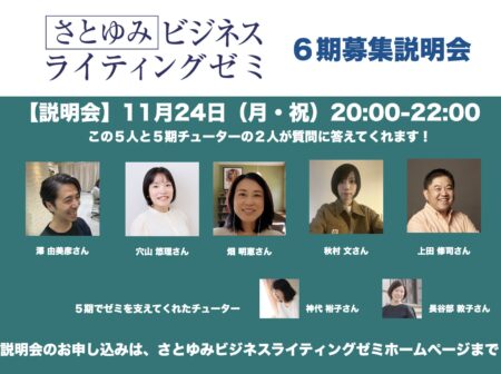 【さとゆみゼミ6期生の説明会&質問会をさせていただきます】 ゼミ日程平日火曜朝コースと土曜朝コースをご用意しています。申込時にどちらをご希望かお伝え下さい。なお平日コースのみ、最終回の実施曜日が変則的になります。 ①火曜 […]